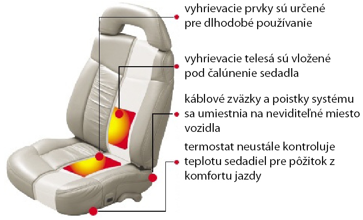 - typ vyhrievania sedadiel vhodný do väčšiny typov sedadiel s textilným alebo koženým